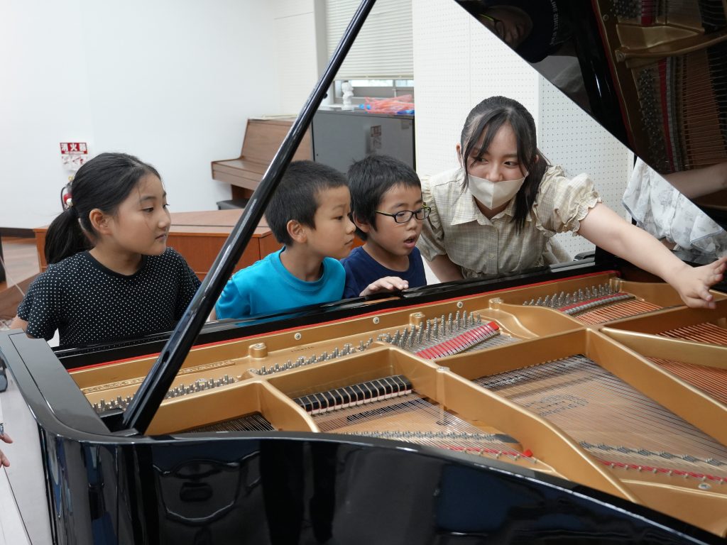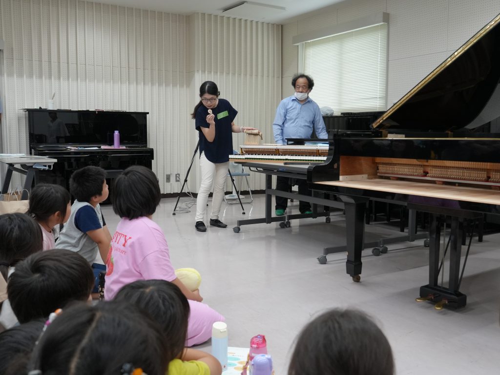 音楽コンサートでは、大熊町所有のピアノも活用しつつ、クラシックからジブリ作品、最近のヒット曲まで、バリエーションに富むプログラムの演奏がありました。また最後には「みんなで歌おう 校歌」と題して、子どもたちと大学生で一緒に校歌を歌ってみる恒例の企画もありました。続いてワークショップでは、「ピアノ博士になろう」と題して、ピアノについての知識が深まるクイズ、ピアノの音が出る仕組みの解明、演奏体験などがあり、子どもたちと大学生で交流しながら、ピアノについて楽しく学ぶ光景が見られました。
