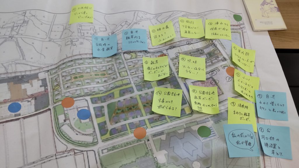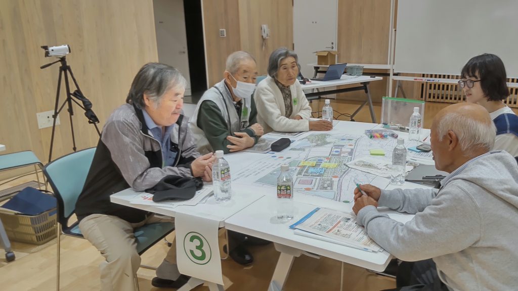 当日の防災ワークショップは3部で構成し、1部では、大熊町役場環境対策課から過去の災害事例と防災目線のまち歩きのポイントの説明を受けました。2部では、5班に分かれて大川原災害公営住宅周辺のまち歩きをしながら、災害時に危険となりそうな箇所の確認をしました。3部では、当サテライトの進行で気になる箇所とその対策について参加者全員で共有し、地区のマップに落し込みました。参加された方からは、「(今までとは)違った(防災の)視点で地区を見ることが出来た」などの感想が聞かれました。