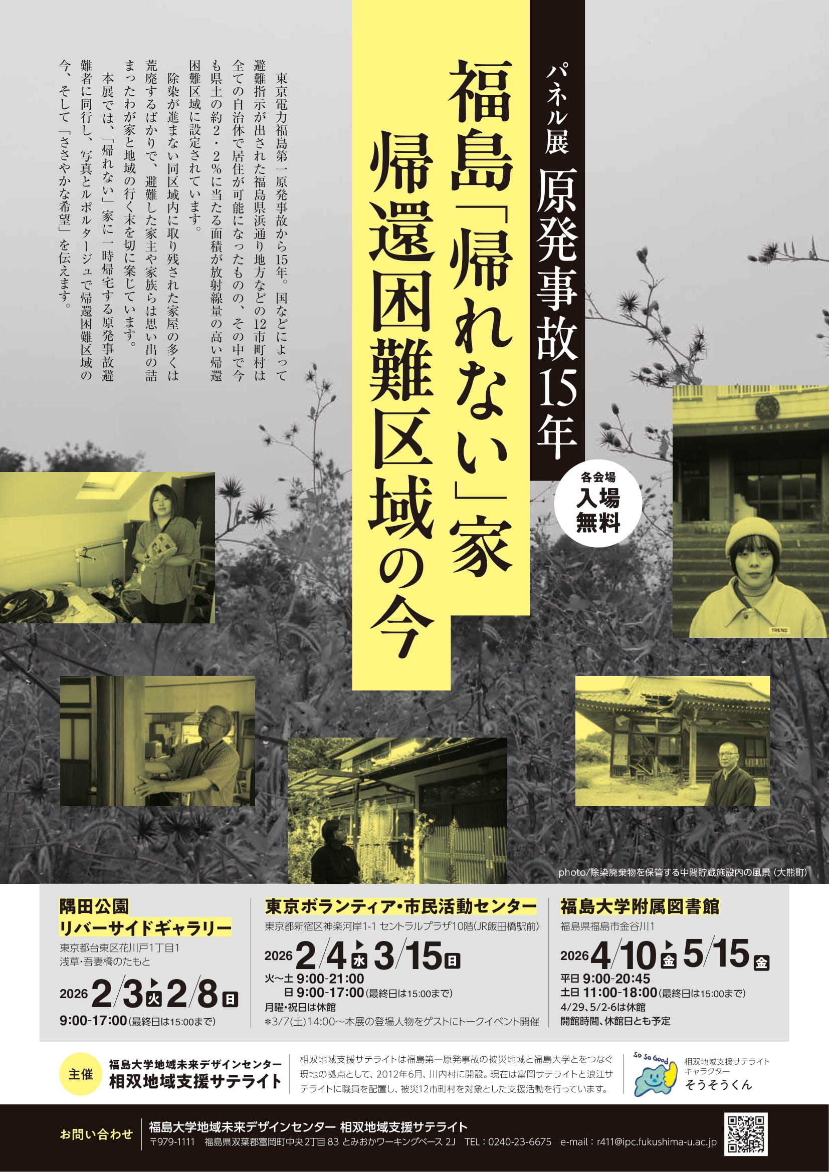 相双地域支援サテライトは2026年2~5月、パネル展「原発事故15年 福島『帰れない』家 帰還困難区域の今」を東京と福島の3会場で開催します。原発事故の影響で住めなくなった家に一時帰宅する避難者5人に同行し、写真とドキュメンタリーで帰還困難区域の今とそれぞれの人生を伝えます。入場無料。